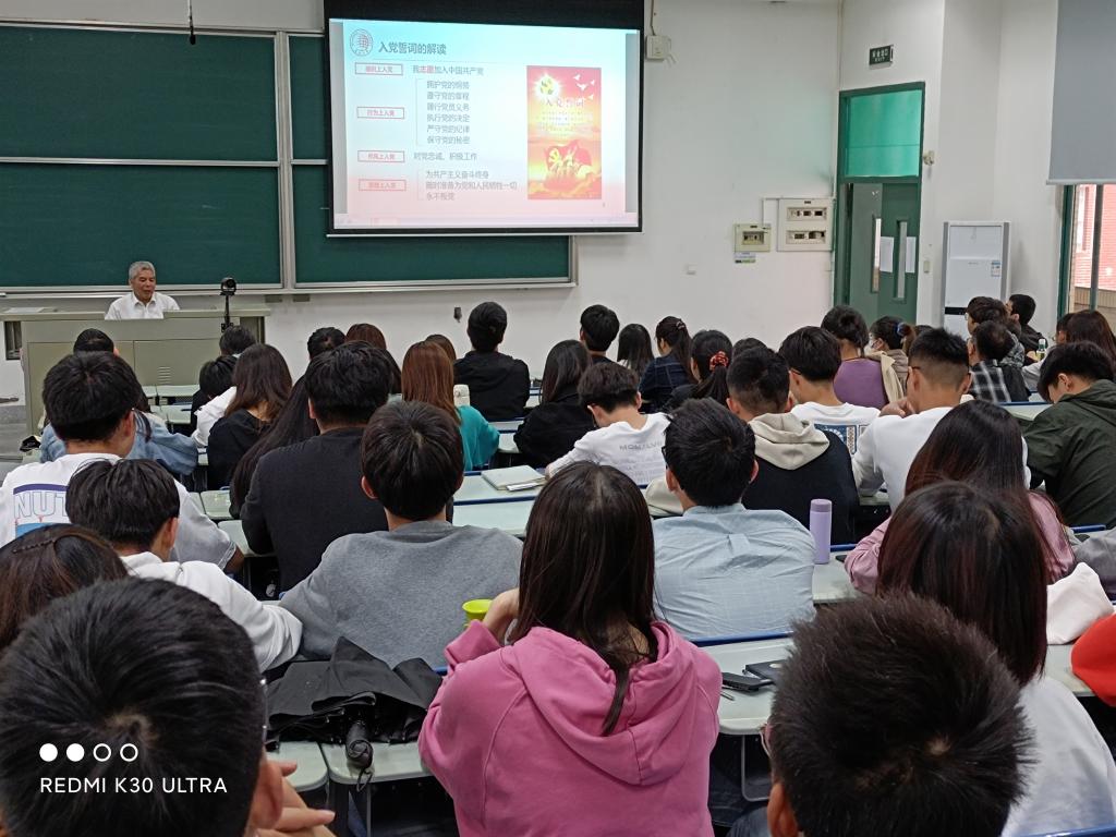 刘斌以习近平总书记在党史学习教育动员会上重要讲话和学习贯彻习近平总书记重要指示批示精神为切入点,从入党誓词的解读、演变和践行三个方面,对入党誓词作了深度阐述。他与同学们一起重温了习近平总书记带领中共中央政治局常委一行瞻仰上海中共一大会址时重温入党誓词的场景,逐句逐字对入党誓词进行解读,同时还以时间为轴,通过鲜明的事例、宝贵的图片素材,为同学们讲解入党誓词经历的五个演变阶段,强调了从建党100周年看入党誓词的重要性。