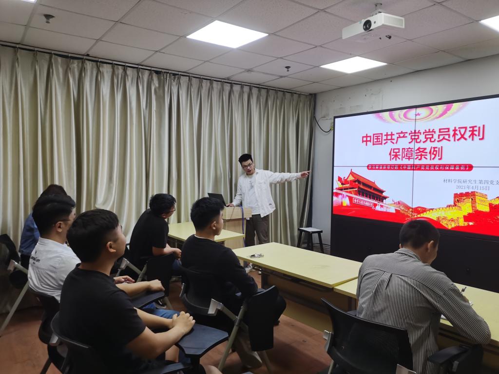 2021年4月15日,伟德国际1949官网登录研究生第四党支部在泛华科技大楼五楼多媒体教室开展了“学习《中国共产党党员权利保障条例》”主题党日活动。支部全体党员和入党积极分子参加学习。