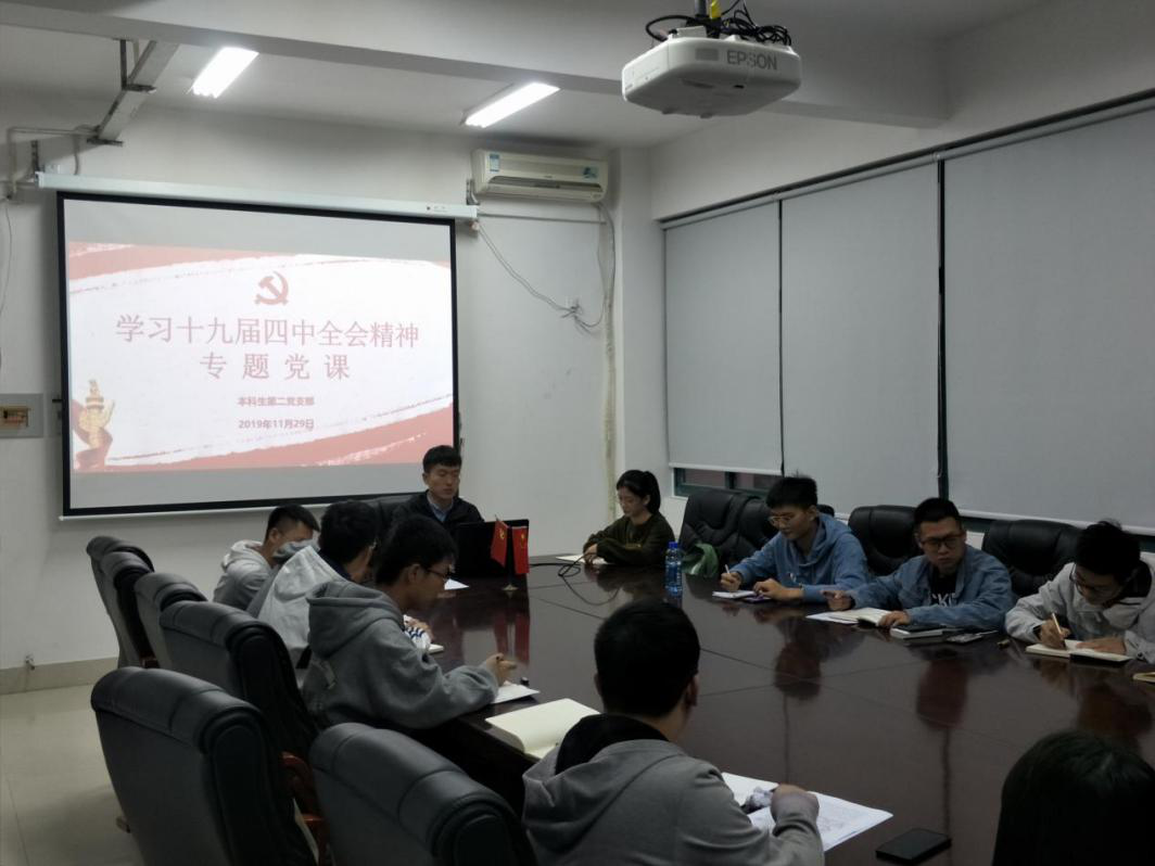 2019年11月29日下午,伟德国际1949官网登录本科生第二党支部学院会议室E4-305举行学习十九届四中全会精神的专题党课支部书记胡伟为支部全体党员做题为“学习贯彻落实党的十九届四中全会精神”专题党课。本次党课由陈雅婷同志主持。