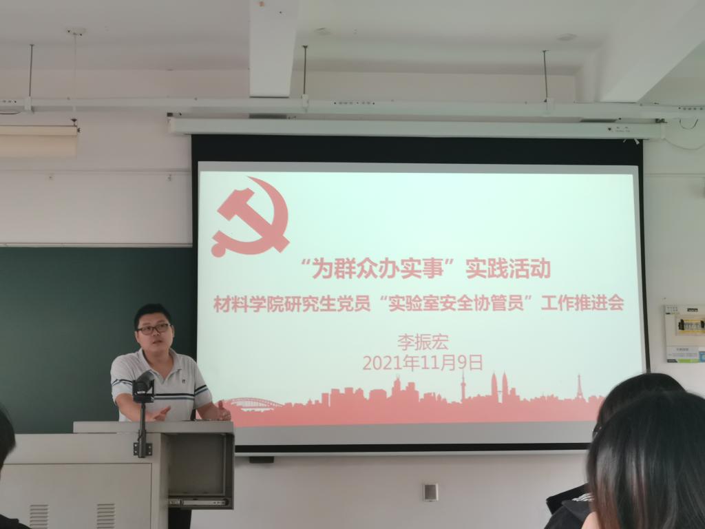 会上,首先,李振宏以近期国内某高校实验室爆燃事故为切入点,强调实验室安全的重要性,他讲到,实验室安全无小事,研究生党员作为实验室的主力军,应在实验室安全与管理中主动发挥作用,做到“作表率,保底线,践宗旨”。