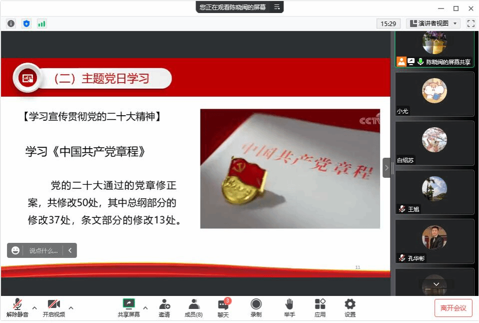 会上,陈晓闽从《中国共产党章程》修改内容进行了导读,对党的性质、党的最高理想和最终目标、党的行动指南等内容条分缕析。她强调,我们必须深刻把握《中国共产党章程》修改的意义,自觉维护《中国共产党章程》的权威性与严肃性。随后,支部党员通过共产党员网观看视频《二十大党章解读-新征程上党旗飘扬》,加深了支部党员对《中国共产党章程》学习。