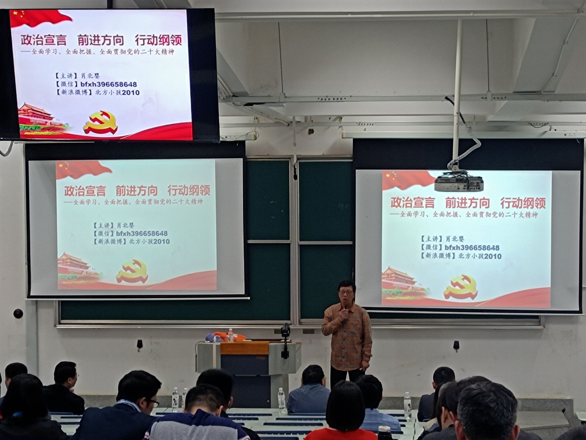 肖北婴以《政治宣言 前进方向 行动纲领——深入学习全面贯彻党的二十大精神》为题,从党的二十大报告基本框架和主要内容、党的二十大会议重大意义、党的二十大精神的丰富内涵、核心要义和实践要求等方面,带领全体教职工深入学习贯彻党的二十大精神。他还结合实际,通过举例子、摆事实、讲道理等多种形式,进一步讲解教育强国、科技强国、人才强国的重要性。他强调,党的二十大报告将教育、科技、人才单独成章为一个部分,凸显了教育事业、科技事业、人才培养在全面建设社会主义现代化国家中的重要作用。最后,他围绕文化强国建设,铸牢中华民族共同体意识,与大家进行了热烈交流。