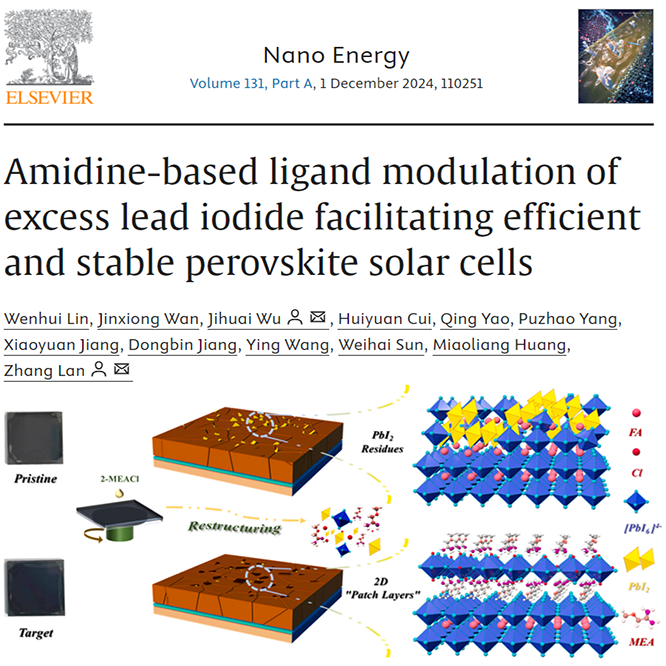 2024届硕士研究生林文辉为第一作者在《Nano Energy》发表题为“Amidine-based ligand modulation of excess lead iodide facilitating efficient and stable perovskite solar cells”的研究论文。在本文中,作者将2-甲氧基乙酰胺基盐酸盐(2-MEACl)作为有机配体来重构PSCs中过量的PbI2。2-MEACl分子形成一个二维(2D)钙钛矿"补丁"层,能有效地钝化界面缺陷,优化能级对准,并显著降低Voc损失。这使得PSCs实现了24.12%的最高PCE,并具有出色的稳定性。