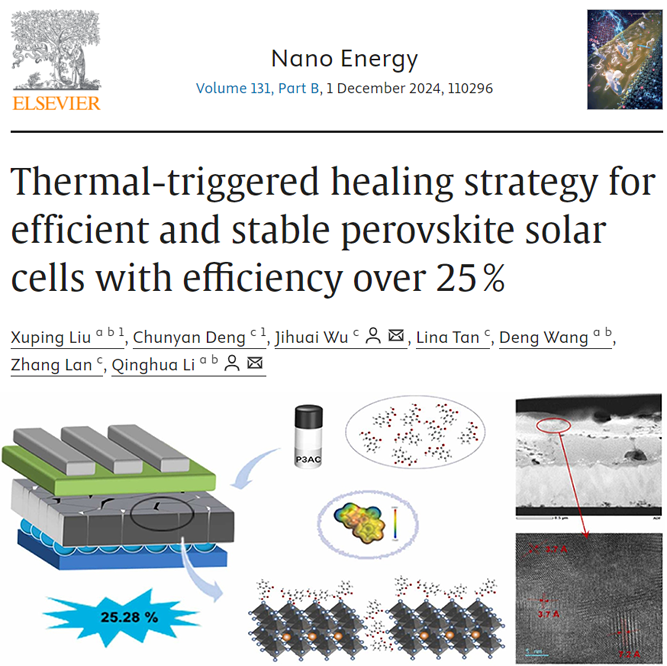 2021届博士研究生刘旭萍和2024届博士研究生邓春炎为共同第一作者在Nano Energy发表题为“Thermal-triggered healing strategy for efficient and stable perovskite solar cells with efficiency over 25 %”的研究论文。作者将一种以双位点分子苯酞-3-乙酸(P3AC)作为中间体的热触发修复策略钝化晶界处的缺陷。在退火过程中,P3AC逐渐迁移到晶界处钝化未配位的Pb²⁺离子并在晶界处与FA⁺形成氢键,从而降低缺陷密度。经P3AC处理的器件获得了25.28%的PCE,且P3AC处理的器件显著提高了稳定性。