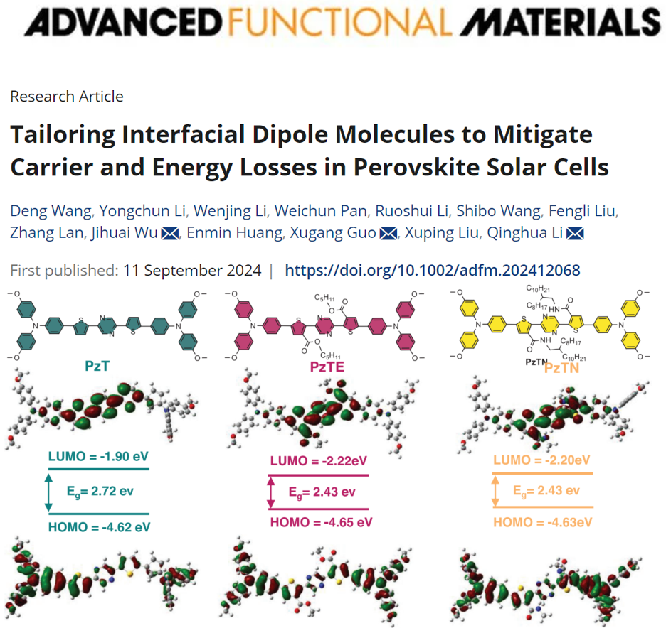 其中,伟德国际1949始于英国2021届博士研究生王邓、2019届硕士研究生李永春以及2023级博士李文静为共同第一作者在Advanced Functional Materials发表题为“Tailoring Interfacial Dipole Molecules to Mitigate Carrier and Energy Losses in Perovskite Solar Cells”的研究论文。作者合成了三个具有相同空穴传输骨架但锚定基团不同的对称供体-受体界面偶极子分子(命名为PzT、PzTE和PzTN)。ID分子被引入到钙钛矿层与空穴传输层之间的界面。具有不同锚定基团和电负性的ID分子表现出不同的偶极矩和界面偶极子,可以调节钙钛矿的表面功函数(WF),减少钙钛矿和空穴传输层之间的能量失配和载流子的非辐射复合损失,提高电荷提取,从而获得更高的开路电压(Voc)。最终,PzTN修饰的PSCs实现了25.34%的最高光电转换效率(PCE), 1.176 V的Voc以及83.27%的填充因子(FF),并表现出卓越的运行稳定性。该研究展示了一种通过界面偶极子分子实现高效且稳定的PSCs的可行策略。