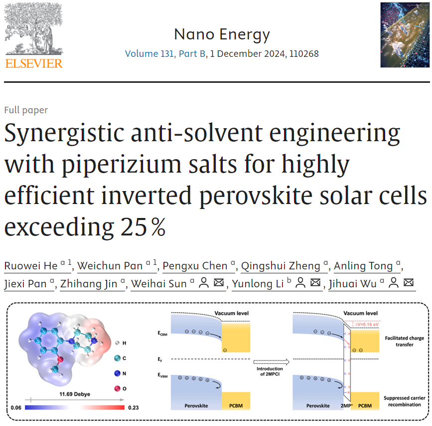 2022级硕士研究生何若玮和2022级博士研究生潘伟春为共同第一作者在Nano Energy发表题为“Synergistic anti-solvent engineering with piperizium salts for highly efficient inverted perovskite solar cells exceeding 25 %”的研究论文。作者提出了一种有效的抗溶剂添加剂策略,将1-(2-甲氧基苯基)哌嗪盐酸盐(2MPCl)作为多功能抗溶剂添加剂引入到倒置PSCs中,以钝化PVK中的缺陷。通过引入2MPCl,研究人员成功制备了高质量的PVK薄膜,实现了25.02%的PCE,显著提高了设备的稳定性。此外,引入2MPCl还有助于调节PVK的能级结构,使PVK表面更倾向于n型,从而促进了PVK与PCBM之间的电子转移。