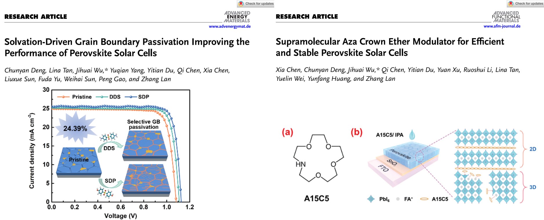2021级博士研究生陈霞和2020级博士生邓春炎为共同第一作者在《先进功能材料》发表题为“Supramolecular Aza Crown Ether Modulator for Efficient and Stable Perovskite Solar Cells”的研究论文。作者将具有独特氮杂环结构的1-aza-15-crown 5-ether (A15C5)作为分子调节剂引入到钙钛矿层与PSCs空穴输运层之间的界面,调制的PSC实现了令人印象深刻的24.13%的效率,同时具有出色的湿度,光和热稳定性。这项工作提供了一个典型的策略,利用超分子冠醚在PSC中的应用。