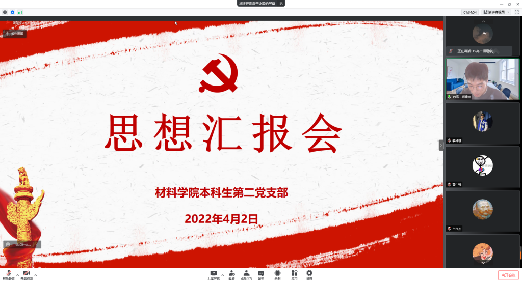 2022年4月2日,伟德国际1949官网登录本科生第二党支部通过腾讯会议举行入党积极分子和预备党员思想汇报会,支部党员入党积极分子代表共同参会,李冰颖主持会议。