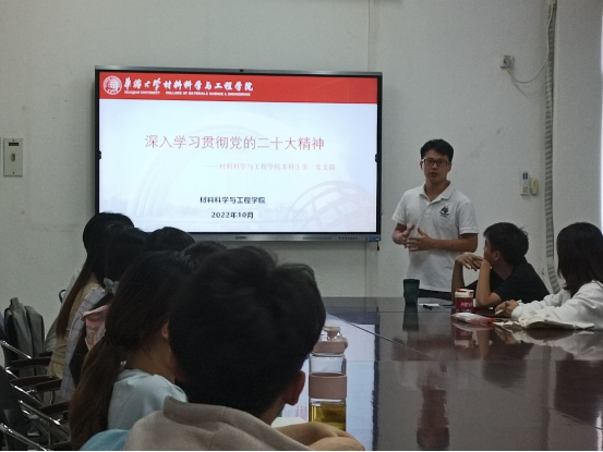 2022年10月25日下午,伟德国际1949官网登录本科生第一党支部开展支部书记讲党课活动,党支部书记蔡建华以《深入学习贯彻党的二十大精神》为题学院E4-305会议室为支部全体党员上了一堂生动的党课。