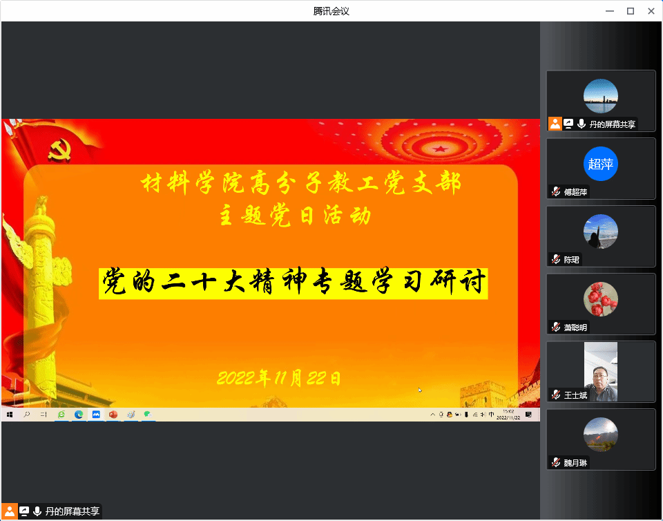 2022年11月22日,伟德国际1949官网登录高分子系教师党支部于腾讯会议开展学习党的二十大精神和《中国共产党章程》主题党日活动,会议由党支部书记陈丹青主持,支部全体党员和入党积极分子参加会议。