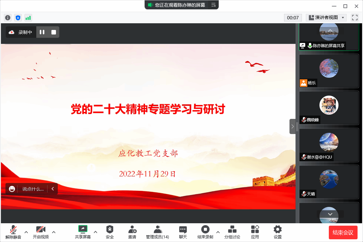 党课结束后,支部开展了党的二十大精神专题学习与研讨会,支部成员依次发言,大家从科研创新和质量提升、教书育人、师德师风建设、共同富裕、绿水青山和环境保护、公共卫生体系的发展、为人民服务能力提升等方面谈感悟、深分析、提建言。通过集中学习和交流研讨,进一步深化了支部党员对党的二十大精神学习领会